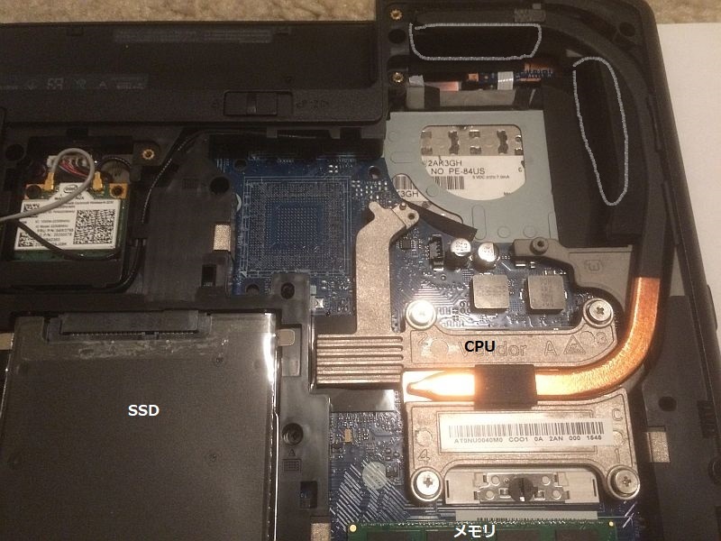黒い〇が電源ケーブルとマザーボードの接点、慎重に外します。