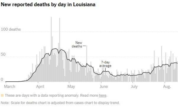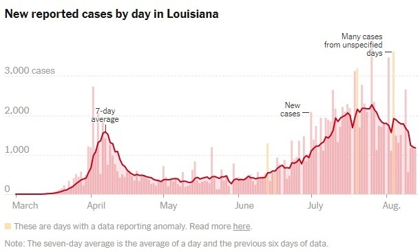 人口比辺りで感染者数総合トップ、さらにここ1週間平均でもトップをひた走り、それによる犠牲者も増加中で全体6位まで上がってきたルイジアナ州ですが、昨日知事はいい方向に向かいつつあるとし、経済再開のフェーズ2をさらに21日間継続することを決定する発表をしました。
