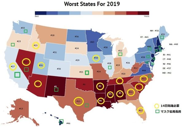 因みに先日紹介したニューヨーク一帯から14日の隔離を宣言された州および知事が公衆の場ではマスク着用を義務付けた州の地図を紹介します。