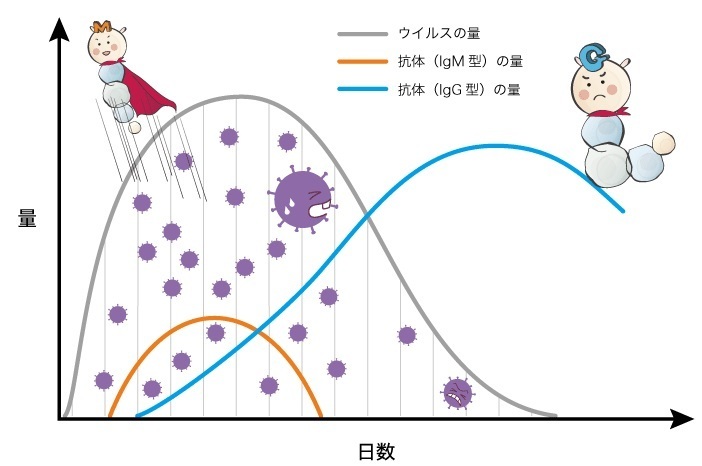 そのうち新型コロナウイルスに対して働くのは主にIgM(初期)とIgG(初期以降)で、前者(IgM)は様々なウイルス感染に対して素早く働くのに対し、後者(IgG)は特定のウイルスに強く結合して働く抗体とのこと。