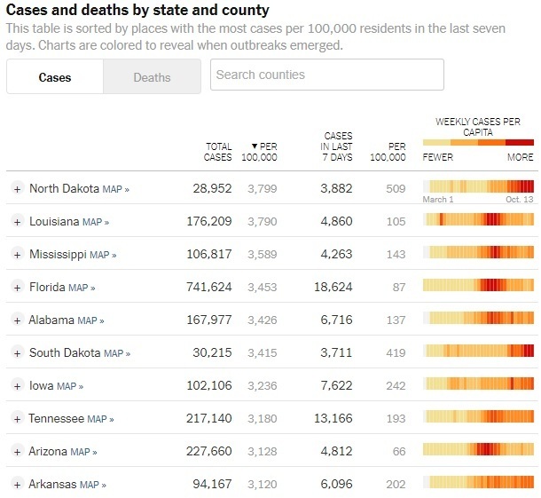 今まで人口比あたりの感染者数で7/22以来、全米ワースト1を守り続けていたルイジアナですが、ついにその座を奪われそうです。人口数の少ないノースダコタの追い上げが激しく、明日か明後日には追い抜かれるでしょう。