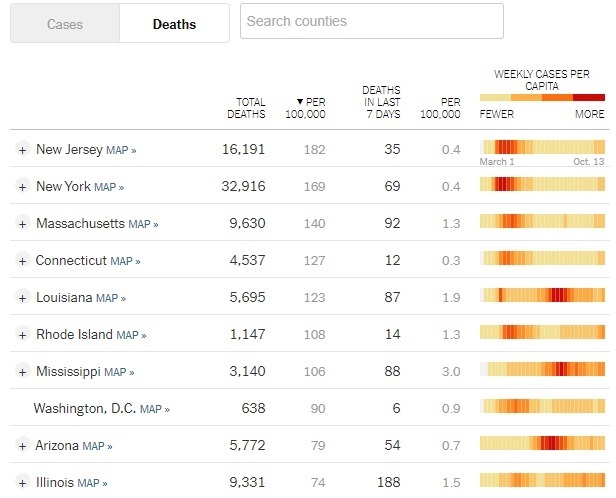 元々ライバルはここより少し人口の少ないミシシッピだと思っていましたが、最近の爆発的な感染拡大により人口が圧倒的に少ないノースダコタ州がトップ(ワースト?)に立ったわけです。感染者数は減ることがないですから、これを抜き返すことは恐らくないでしょう。